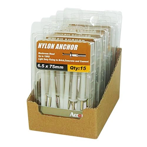 Nylon Mushroom Head, Screw Dia 3.2-3.8mm, Drill Dia 6mm, Hole Drill 80mm. Designed For Use In A Variety Of Substrates Such As Concrete, Stone, Solid Brick, Solid Block, Hollow Brick, Hollow Block And Hollow Slab, Quick And Easy To Install And Remove, Can Be Hammered All The Way Into The Hole Without Pre-Expansion, Nylon Body Provides Insulation Between Drive Screw And Work Surface.