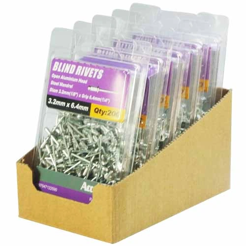 Open Aluminium Head, Steel Mandrel, Diam 3.2mm(1/8″)xGrip 6.4mm(1/4″), Open Aluminium Blind Rivets are the Most Popular Fixing Used for Most Sheet Fabrications and General Purpose Applications, Commonly Used for Windows, Security Doors, Down Pipes, Guttering And General Purpose External Applications, Strong Vibration Resistance And Clamping Force, Lightweight and Easy to Set, Good Corrosion Resistance.