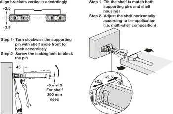 Inclination adjustment: Via 10 mm spanner on dowel -6 to +13Height adjustment: Via slots on screw in plateSide adjustment: manual and locking screw
